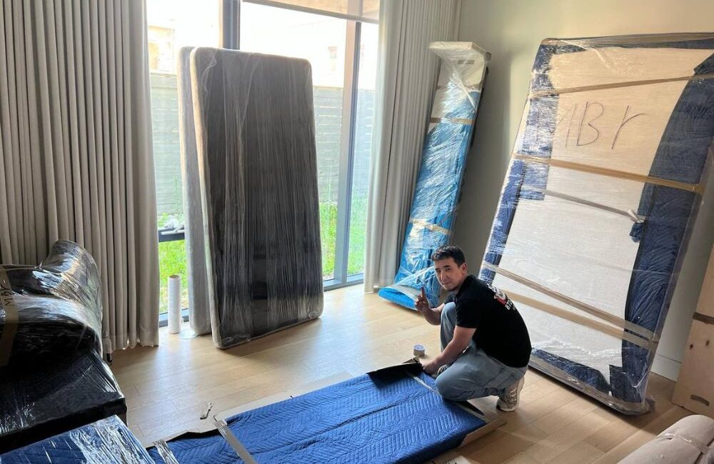 Furniture protection is included. Full-box packing is optional (hourly) with materials billed at cost.